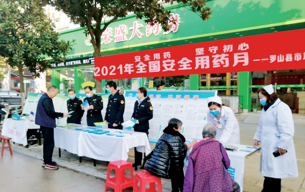 近日,罗山县市场监管局全面启动以“安全用药,坚守初心”为主题的2021年全国药品安全月宣传活动。该局通过采取悬挂横幅、发放宣传资料等形式,向广 大群众宣传药品安全、消费维权及投诉举报等方面知识。图为活动现场。(潘广 杨梅 摄)