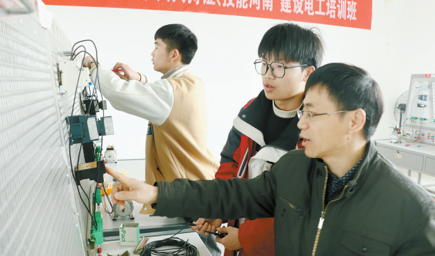 昨日,在罗山县中等职业学校,老师在为学生讲解电力专业知识。近年来,罗山县中等职业学校不断在产教融合、校企合作上大胆创新,积极探索,按照校企“共建专业、共担课程、共编教材、共享师资、共享资源”的思路,创新发展“校园+企业”模式,在县产业集聚区创建实训基地,推行现代化学徒制,规范岗位实习,形成工学结合、育训一体、知行合一、协同育人的职校发展模式,培养了一大批技术技能型人才。