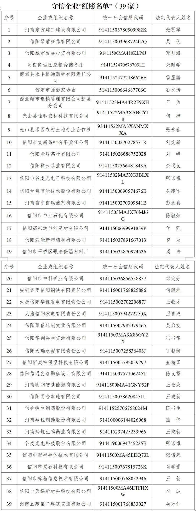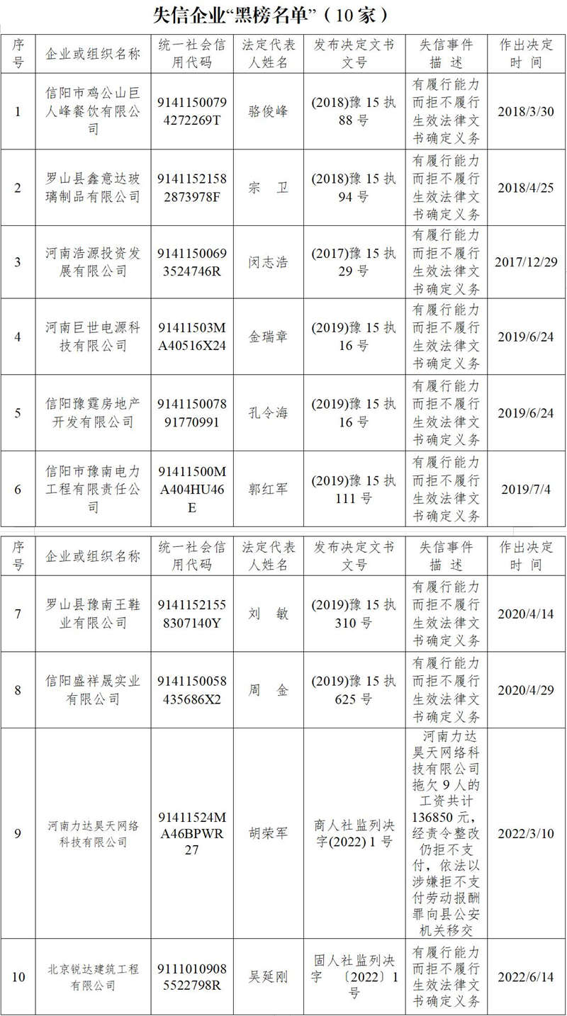 信阳市2022年第一期诚信建设“红黑榜”