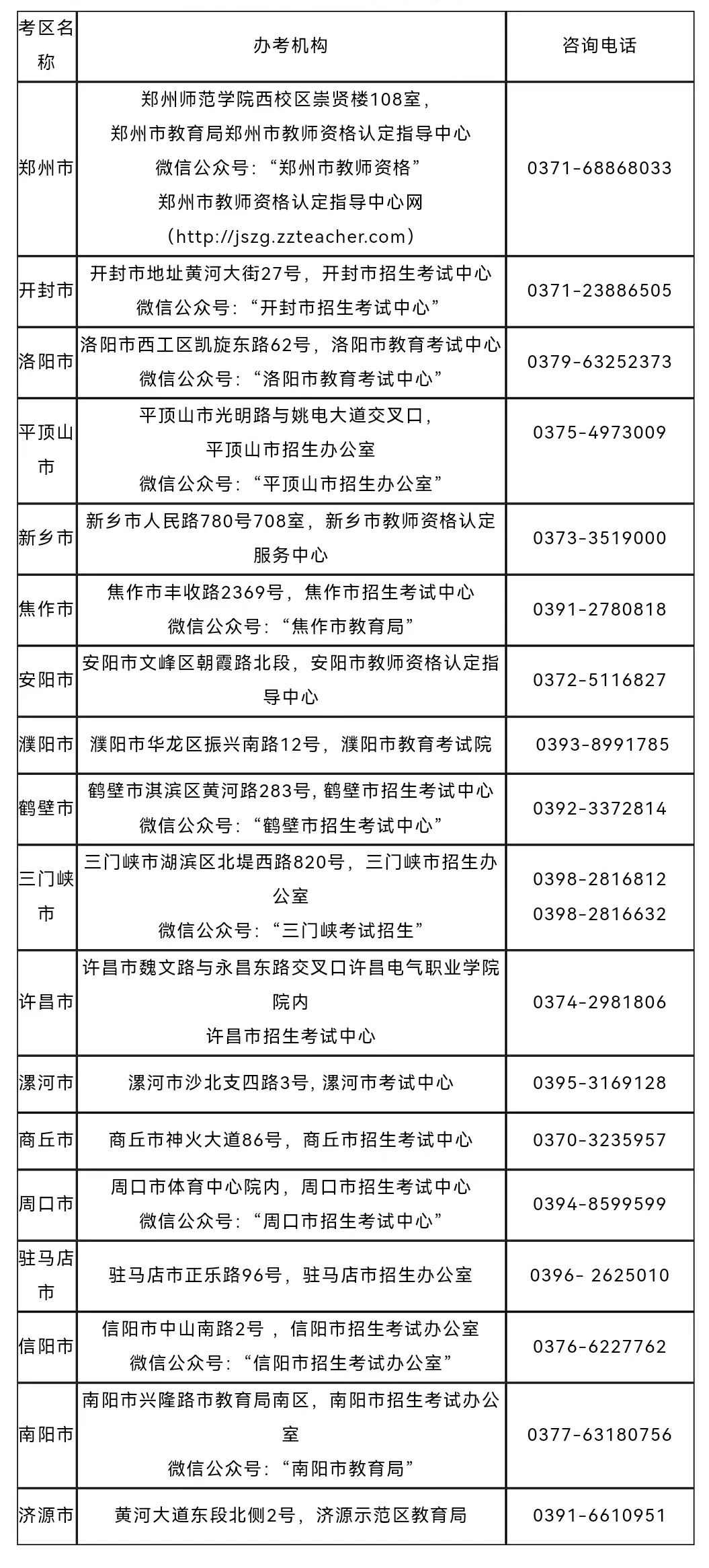 中小学教师资格考试(面试)各考区相关联系方式见下表:
