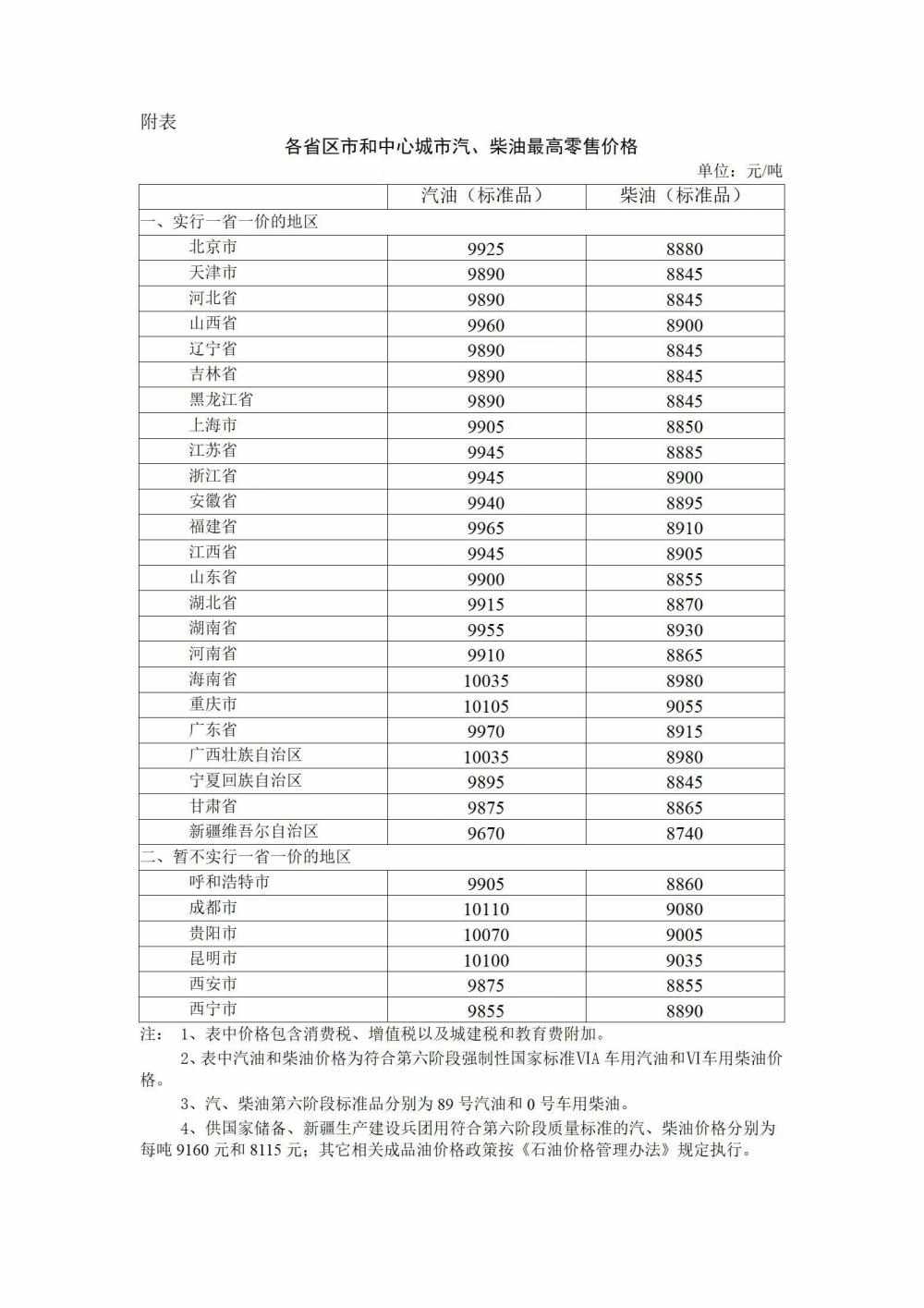 附:各省区市和中心城市汽、柴油最高零售价格
