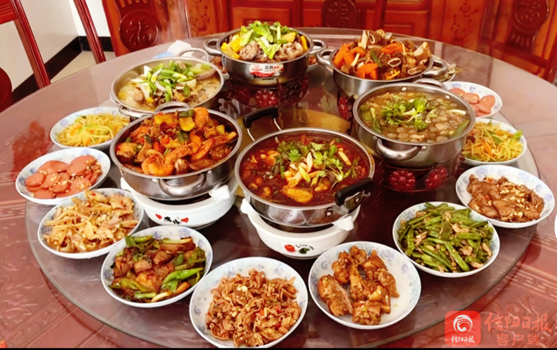固始县也是美食之乡,年夜饭也是相当讲究,煎炒烹炸样样俱全。主菜以腊味为主,厨房里两口热锅,一个炖羊肉,一个炖鹅块,还有准备好的固始鸡、固始鸭等。热菜环节,各种固始小炒接连上席。压轴时,被赋予美好寓意的红烧鱼登场。饱后休息时,一锅熬好的浓米酒,汤圆加冰糖,甜到每个人的心里。