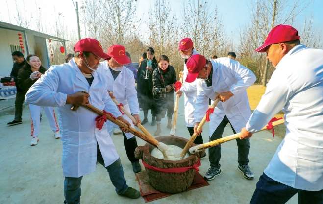 12月3日,在光山县文殊乡东岳村直播助农电子商务工作站,工作人员正在打制糍粑通过网上直播销售。近年来,光山县采取多种方式,鼓励村民推广流传千年历史传统手工糍粑手艺,糍粑是由糯米蒸熟再通过特质石材凹槽冲打而成,食用时可烤、可煮、可煎、可炸,很受欢迎,其传统制作工艺已列入非物质文化遗产。