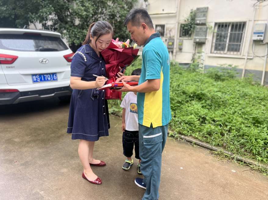 经过联系确认,胡仕博不在家,高建华在核对相关身份证件后,将录取通知书正式交至胡仕博的母亲手中,并附赠鲜花以表祝贺。