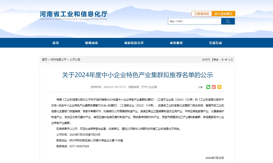 根据《工业和信息化部办公厅关于组织推荐2024年度中小企业特色产业集群的通知》和《工业和信息化部关于印发<促进中小企业特色产业集群发展暂行办法>的通知》,经县级工业和信息化主管部门自主申报、省辖市级工业和信息化主管部门核查推荐、专家评审等环节,拟推荐巩义市高精铝制造产业、淇滨区商业卫星装备制造及应用产业、平桥区绿色家居产业、太康县锅炉制造产业、洛龙区光电元器件产业、淮阳区塑料包装及管材制品产业、西峡县特钢新材料产业、灵宝市铜精深加工产业等8家集群,申报国家级中小企业特色产业集群。