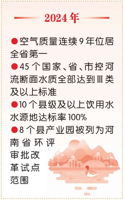 一年来,我市坚决打赢蓝天保卫战,空气质量连续9年位居全省第一,“抬头见蓝”已成新常态。同时积极推进碧水保卫战,坚持“一河一策、一断面一策、一排污口一策”,45个国家、省、市控河流断面水质全部达到Ⅲ类及以上标准,10个县级及以上饮用水水源地达标率100%,“绿水”处处可见。此外,我市还深入开展国土绿化提速行动,精心谋划河南大别山革命老区生态保护修复工程,推进全域生态保护修复,城市绿廊游人如织、青年营地活力四射,下班即旅行、下楼即露营、推窗即见绿;诗意新集、画里郝堂,让广大游客和市民望得见山、看得见水、记得住乡愁,良好生态成为美丽信阳最耀眼的名片,一幅人与自然和谐共生的生态画面不断显现……