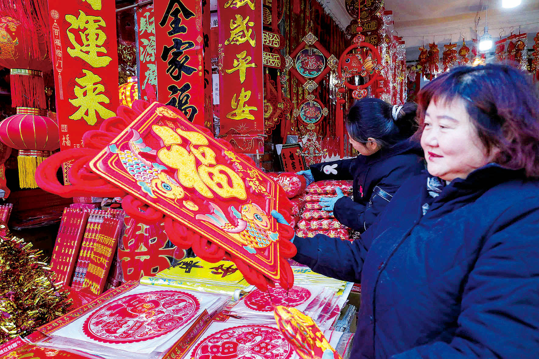 1月15日,市民在光山县一处年货市场里选购春节饰品。春节将至,光山县各地年货市场年味渐浓,以“蛇年”为主题的各种对联、年画、“福”字、红灯笼、中国结等节庆饰品纷纷上架,成为抢手的热门商品。(谢万柏 摄)