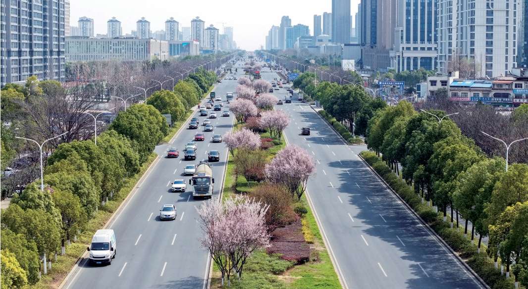 春风吹拂,羊山新区新七大道上的一树树紫叶李盛开如雪,将新七大道装点得浪漫无比,来往车辆犹如行驶在画中。