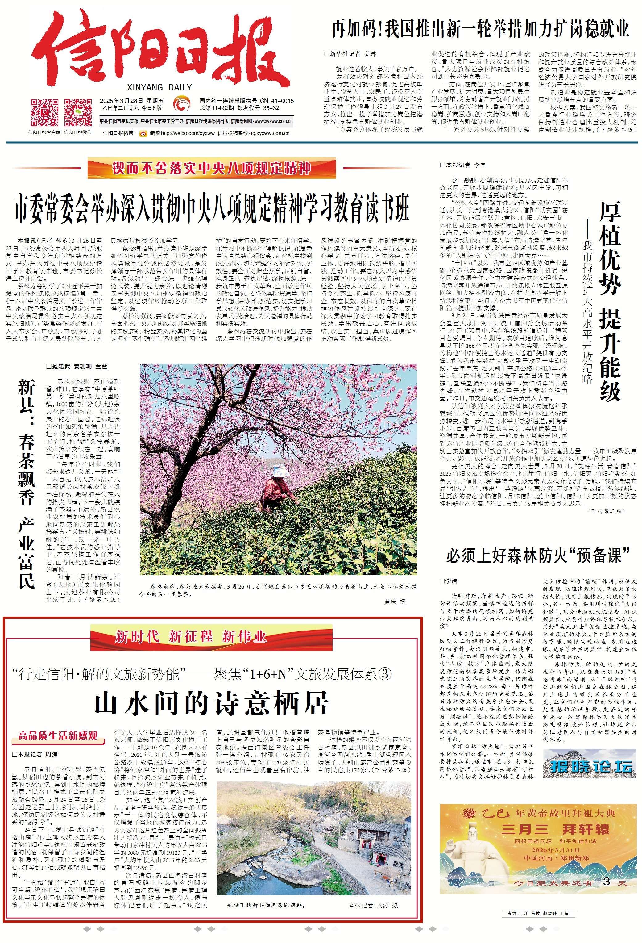 春日信阳,山峦吐翠,茶香氤氲。从稻田边的茶香小院,到古村落的乡愁记忆,再到山水间的秘境栖居,“民宿+”模式正串起信阳文旅融合路径。3月24日至26日,采访团走进罗山县、新县、固始县三地,探访民宿经济如何成为乡村振兴的“新引擎”。