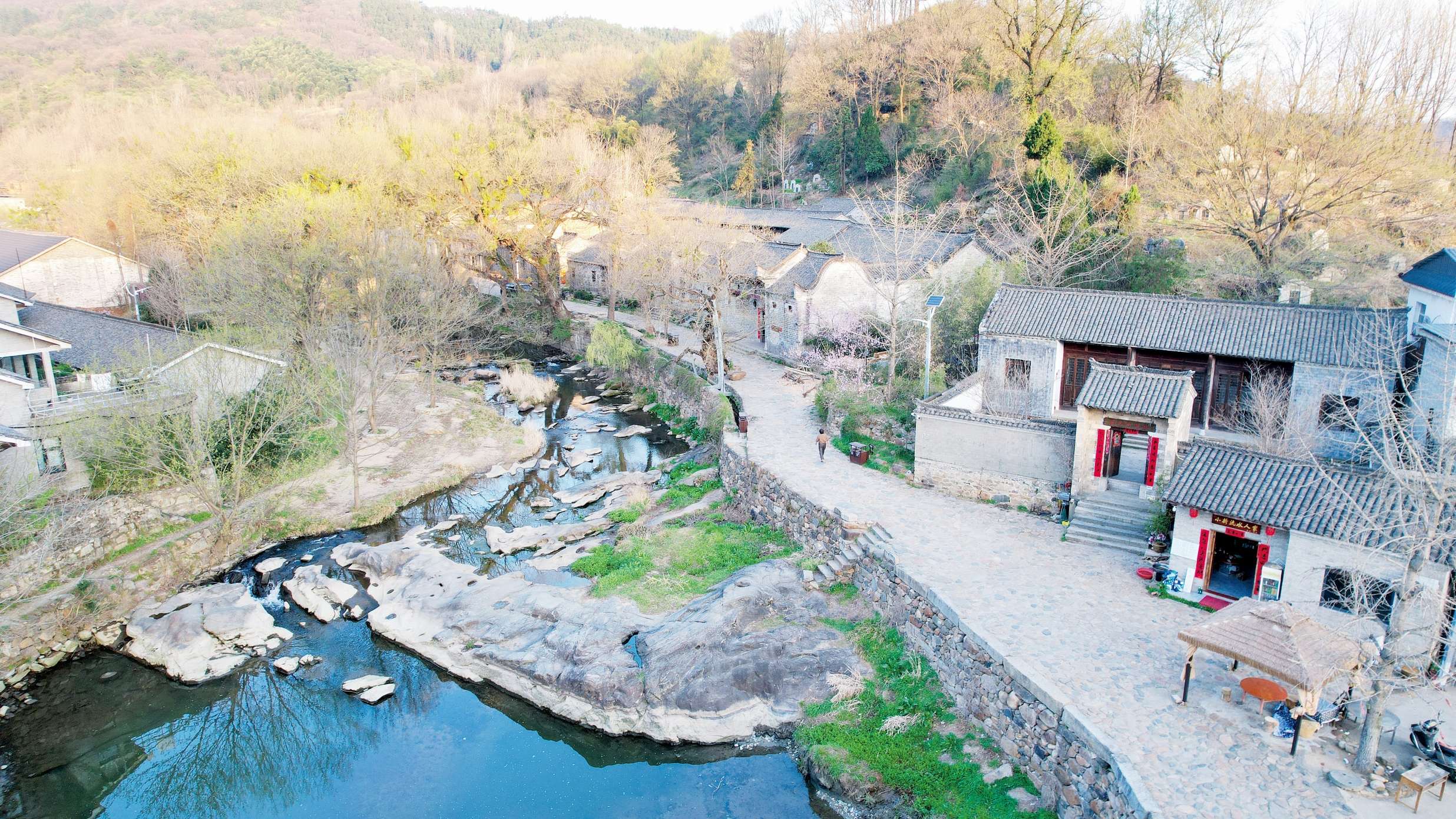 航拍下的新县西河湾民宿群。