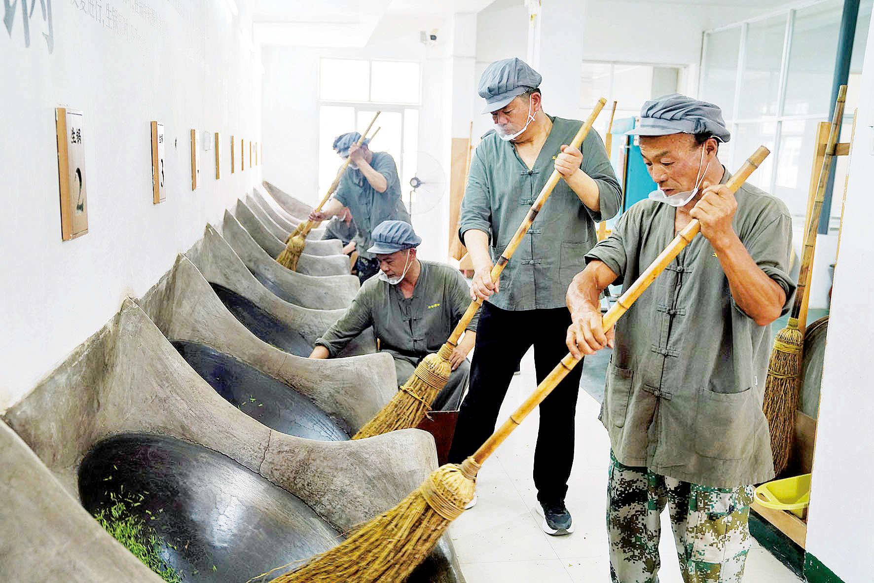 从树上到茶杯,从树叶到茶叶,这是匠心与自然的对话。信阳毛尖的炒制,需经摊晾、生锅杀青、熟锅理条、三烘三焙等十余道工序。生锅高温杀青,茶芽在竹帚翻飞中褪去青涩;熟锅以大把揉捻,赋予其“细圆光直”的筋骨;三次炭火烘焙,则锁住氨基酸的鲜灵,让茶汤“香高味浓,汤色清绿”。老茶工常说:“七分采,三分炒。”手工炒制时抓条甩条的力道,恰似太极推手,将山岚云雾的灵气揉入叶脉。正是独特的炒制技艺,信阳毛尖才有了“雨前采得三春露,味同仙翁石上泉”的别致风味。