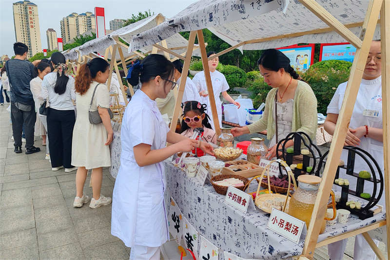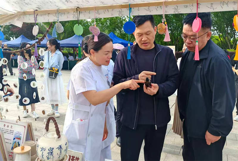 中医药文创产品展示区内,中药膳食、中药饰品、文创产品等摆满展台。药食同源展示活动成为“舌尖上的中医”打卡地,八珍膏、酸梅汤等膏方茶饮引来市民品尝;中医药文创展台上,中草药书签、贝壳风铃等创意产品琳琅满目。在中药香包展台前,市民们已排起长队,只见一名护士巧手翻飞,将艾叶、薄荷、丁香等填入香囊,大学生小陈将成品系于腕间惊喜道:“驱蚊香囊可比化学喷雾雅致多了,最主要的是健康。”