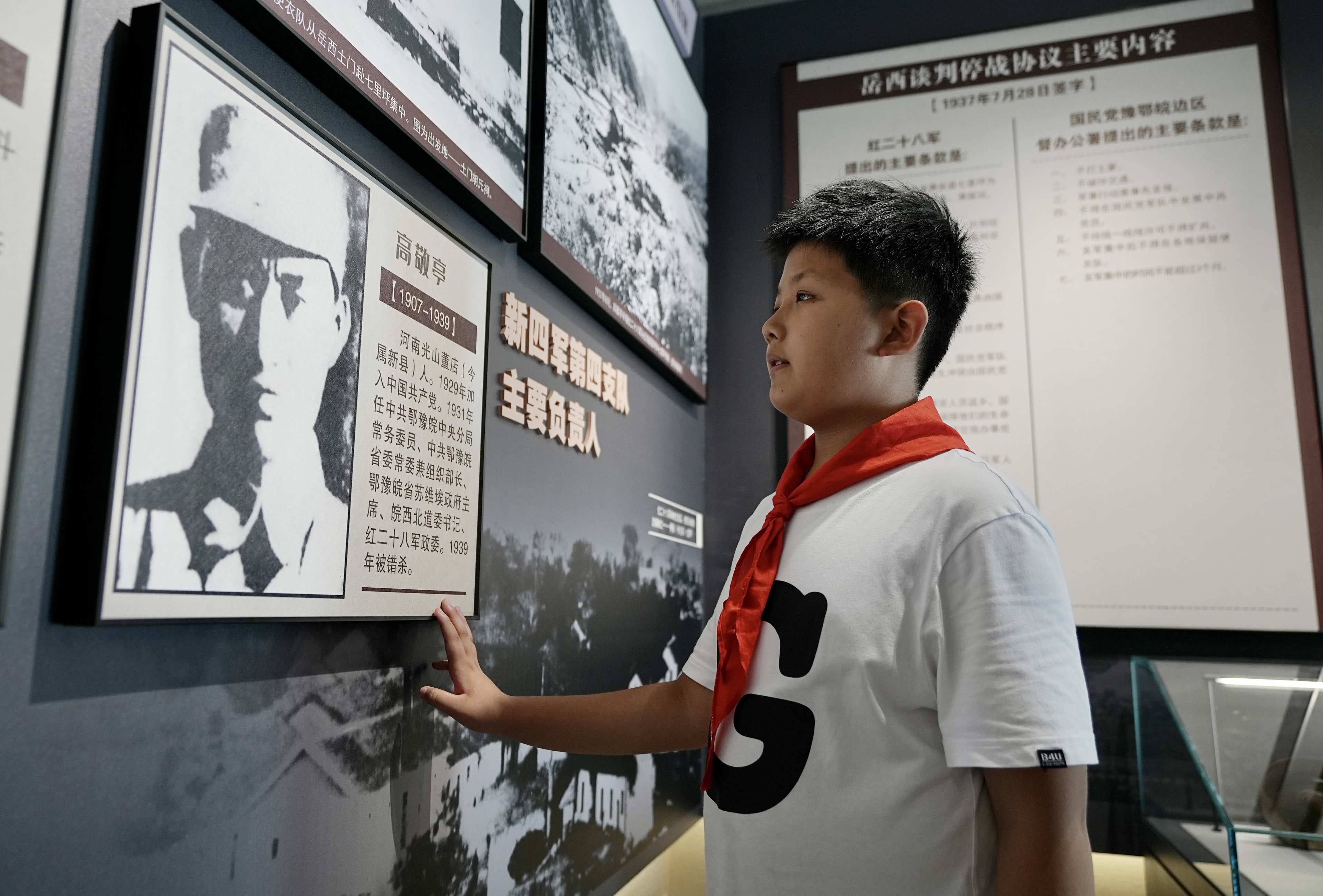 昨日上午,在鄂豫皖苏区首府革命博物馆,11岁的“小小讲解员”杨凌鹏正在给小伙伴们讲他写给抗日英烈高敬亭的信。杨凌鹏的讲述让在场的大人们红了眼眶。