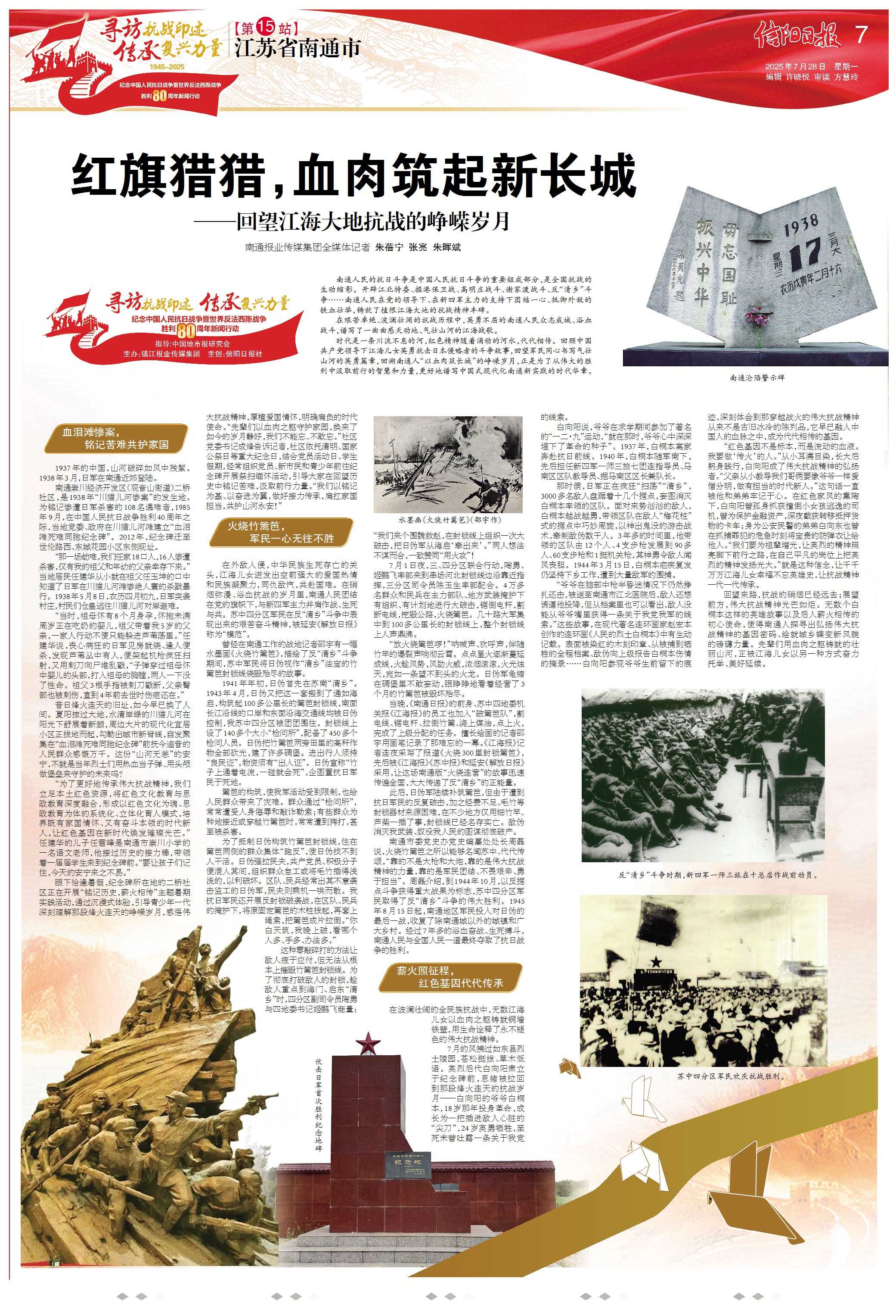 时代是一条川流不息的河,红色精神随着涌动的河水,代代相传。回顾中国共产党领导下江海儿女英勇抗击日本侵略者的斗争故事,回望军民同心书写气壮山河的英勇篇章,回溯南通人“以血肉筑长城”的峥嵘岁月,正是为了从伟大的胜利中汲取前行的智慧和力量,更好地谱写中国式现代化南通新实践的时代华章。