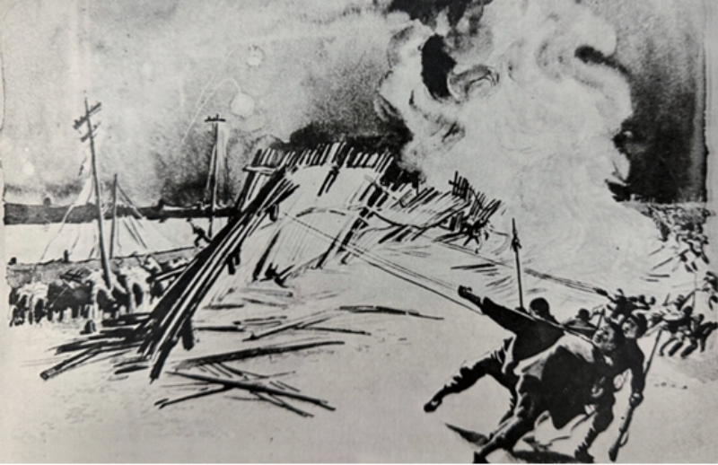 “放火烧篱笆啰!”呐喊声、欢呼声,伴随竹竿的爆裂声响彻云霄。点点星火逐渐蔓延成线,火趁风势,风助火威,浓烟滚滚,火光烛天,宛如一条望不到头的火龙。日伪军龟缩在碉堡里不敢妄动,眼睁睁地看着经营了3个月的竹篱笆被毁坏殆尽。
