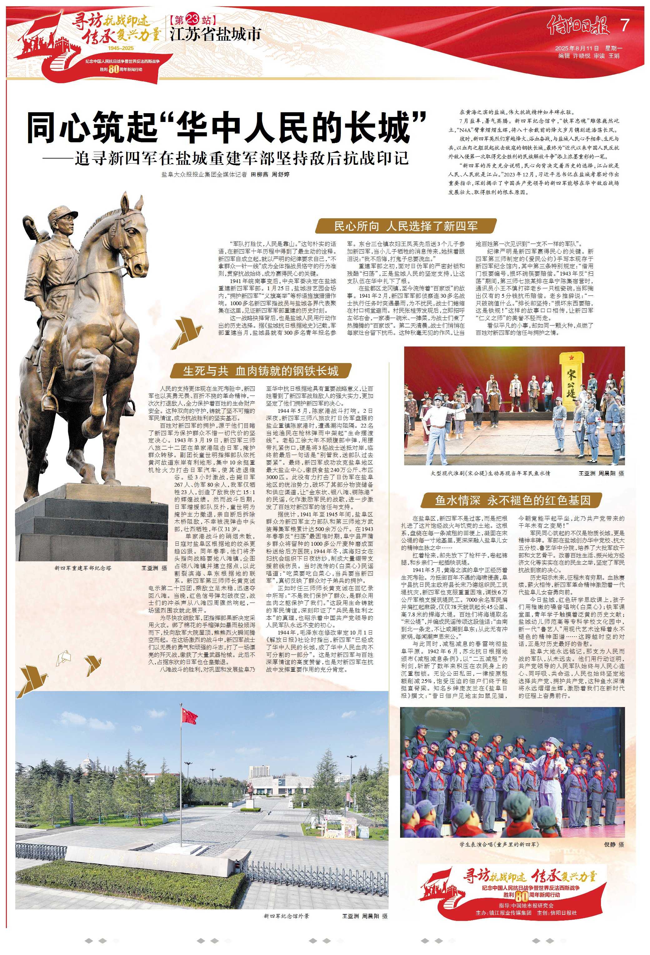 彼时,新四军英烈们穿越烽火、浴血奋战,与盐城人民心手相牵、生死与共,以血肉之躯筑起抗击敌寇的钢铁长城,最终为“近代以来中国人民反抗外敌入侵第一次取得完全胜利的民族解放斗争”添上浓墨重彩的一笔。