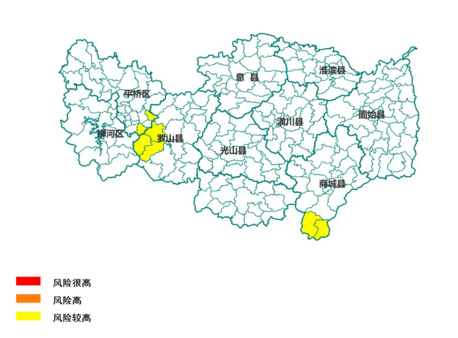 地质灾害黄色预警县区:平桥区、罗山县、商城县,发生地质灾害的风险较高。