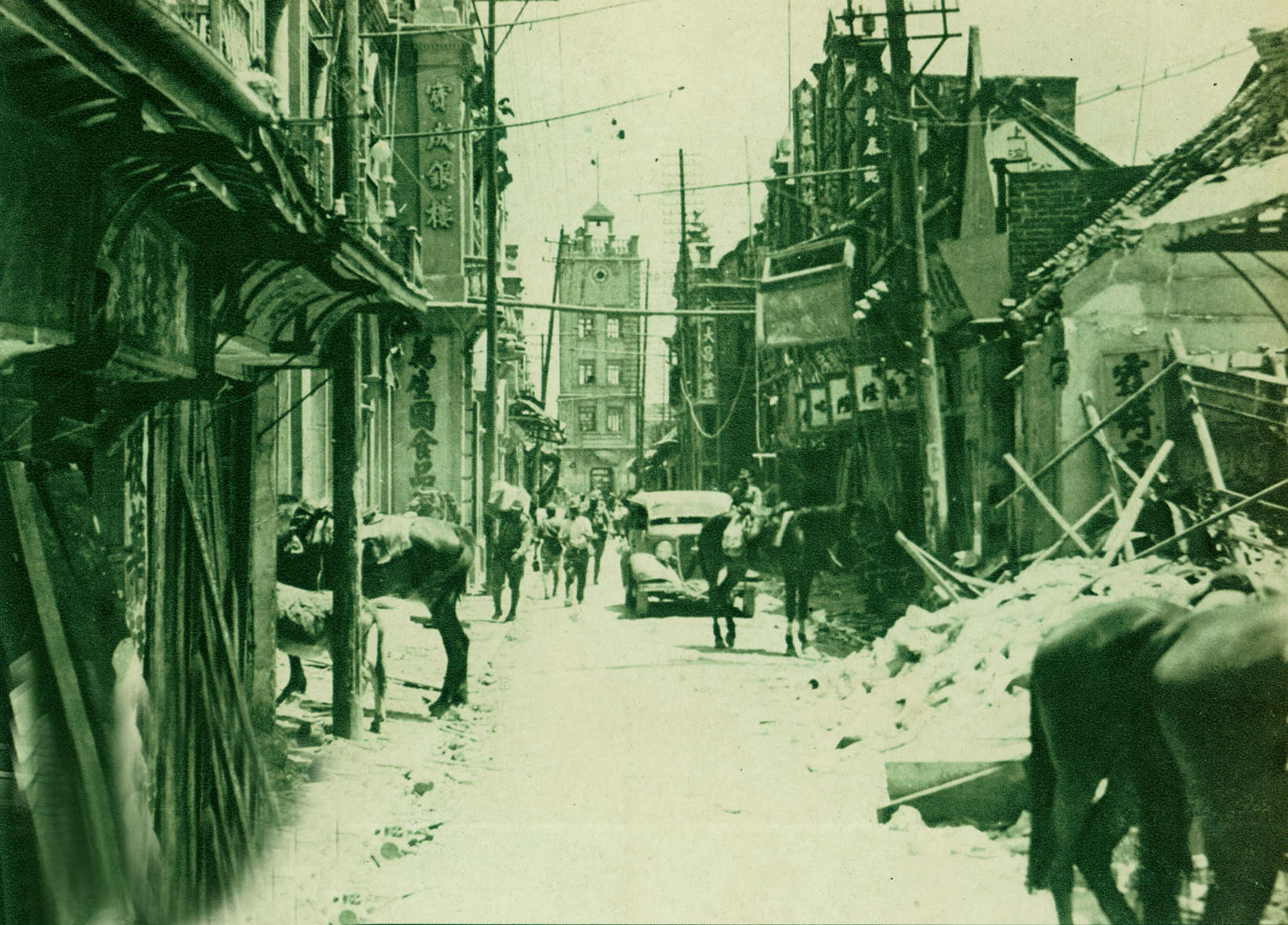 日军炸毁徐州大同街,远处为钟鼓楼。资料图片