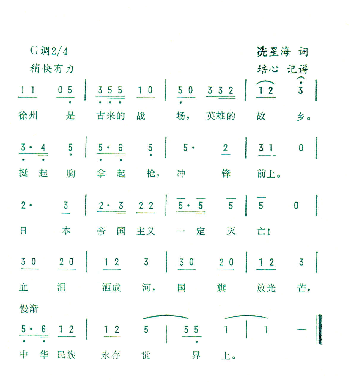 “徐州是古来的战场,英雄的故乡。挺起胸拿起枪,冲锋前上。日本帝国主义一定灭亡!血泪洒成河,国旗放光芒,中华民族永存世界上。”