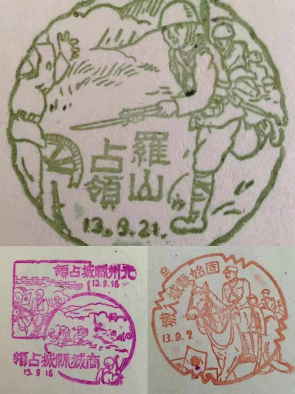 还有一组特殊的明信片,格外刺眼——光州县城占领、商城县城占领、固始县城入城、罗山县城占领……“当年日军每占一城,就印发明信片,炫耀他们的‘战绩’。”杨峰解释说。