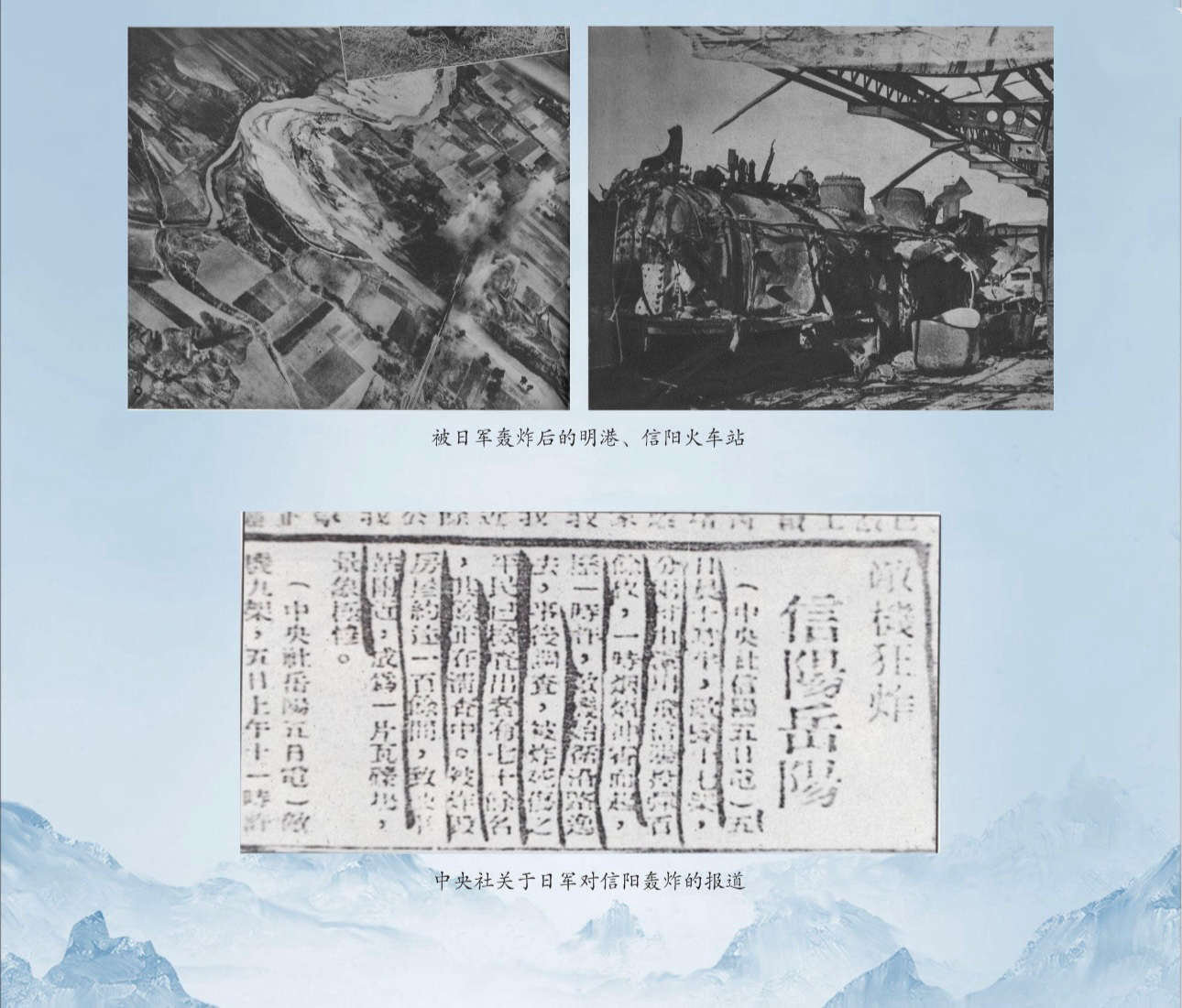 1938年6月至9月,日军对豫南城乡展开疯狂空袭。“信阳轰炸惨案”的烙印永远刻在了这片土地上。《豫南抗战史料选编》中一段文字,字字锥心:1938年9月的一天,信阳城南浉河桥两端,百名乡民正浣衣、担水,二三十人在桥上匆匆赶路。突然,5架日军飞机猛窜而来,低飞盘旋。飞机反复向桥上投弹,桥被炸毁,人被炸得血肉模糊,河水染得殷红,残肢顺河漂流,不少伤残者倒入河中溺死,幸存者寥寥无几。