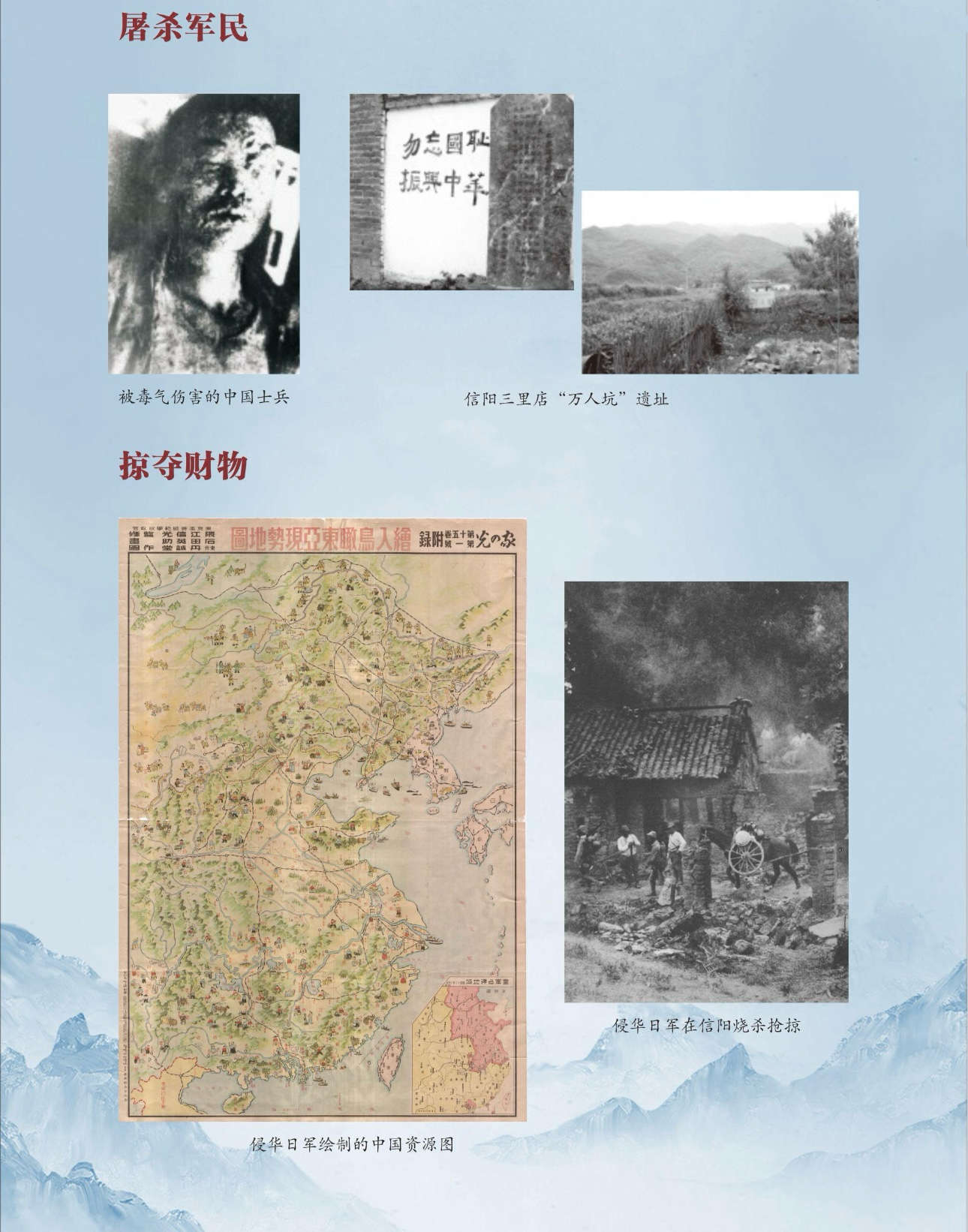 展墙之上,每一幅照片都触目惊心:被日军狂轰滥炸后的信阳火车站千疮百孔,一辆焦黑的火车被撕开了大口子,仿佛在控诉这场暴行;被毒气伤害的中国士兵伤口溃烂“熔化”了五官,剧烈的疼痛感扑面而来;而那面写有“勿忘国耻 振兴中华”的白墙,依旧铮铮作响。