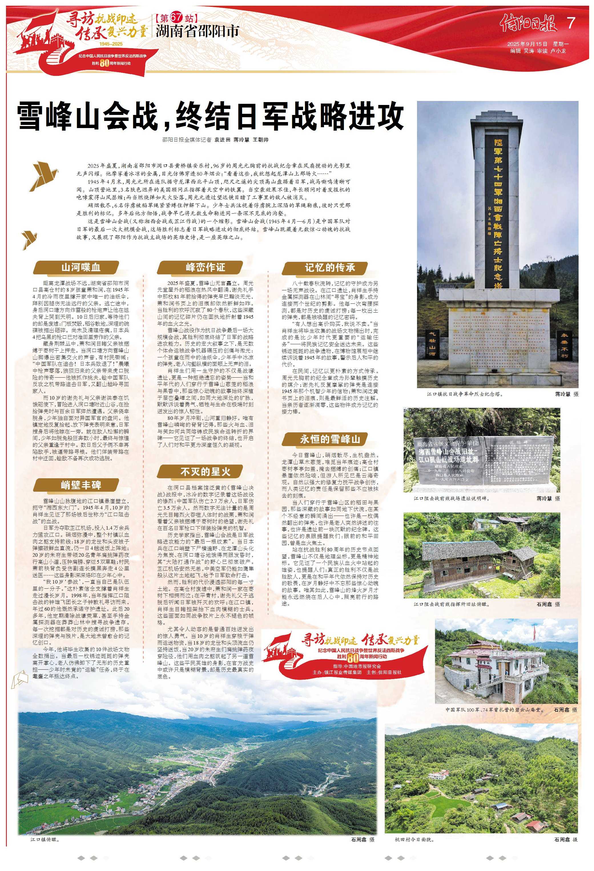 这是雪峰山会战(又称湘西会战或芷江作战)的一个缩影。雪峰山会战(1945年4月—6月)是中国军队对日军的最后一次大规模会战,这场胜利标志着日军战略进攻的彻底终结。雪峰山既藏着无数惊心动魄的抗战故事,又展现了邵阳作为抗战主战场的英雄史诗,是一座英雄之山。