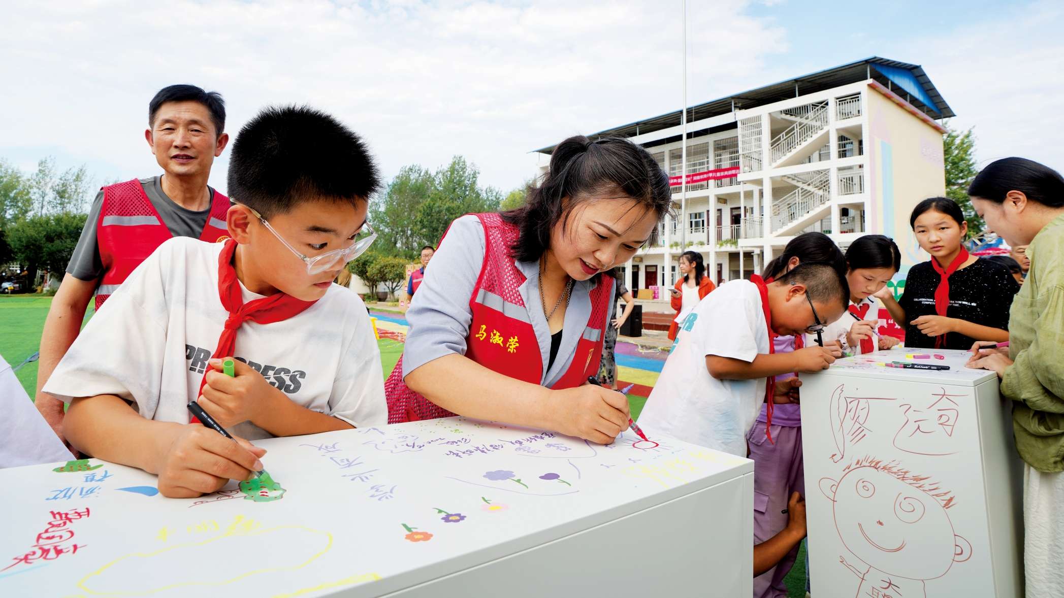 简短的捐赠仪式后,孩子们还跟爱心人士一起给新书柜“梳妆打扮”。大家拿起画笔,在书柜上挥洒想象,尽情涂鸦。画笔在柜面上跳跃:有的勾勒出灵动的花鸟,有的描绘出心爱的小动物,有的则用色彩描绘对美好未来的憧憬。志愿者与爱心人士也俯身提笔,在画作旁写下一句句温暖的祝福与殷切的期望。柜面上的每一幅作品,都不再是简单的涂鸦,而是孩子们纯真梦想与成人世界关爱期盼的完美交融,让冰冷的柜体瞬间变成了承载爱与希望的艺术空间。