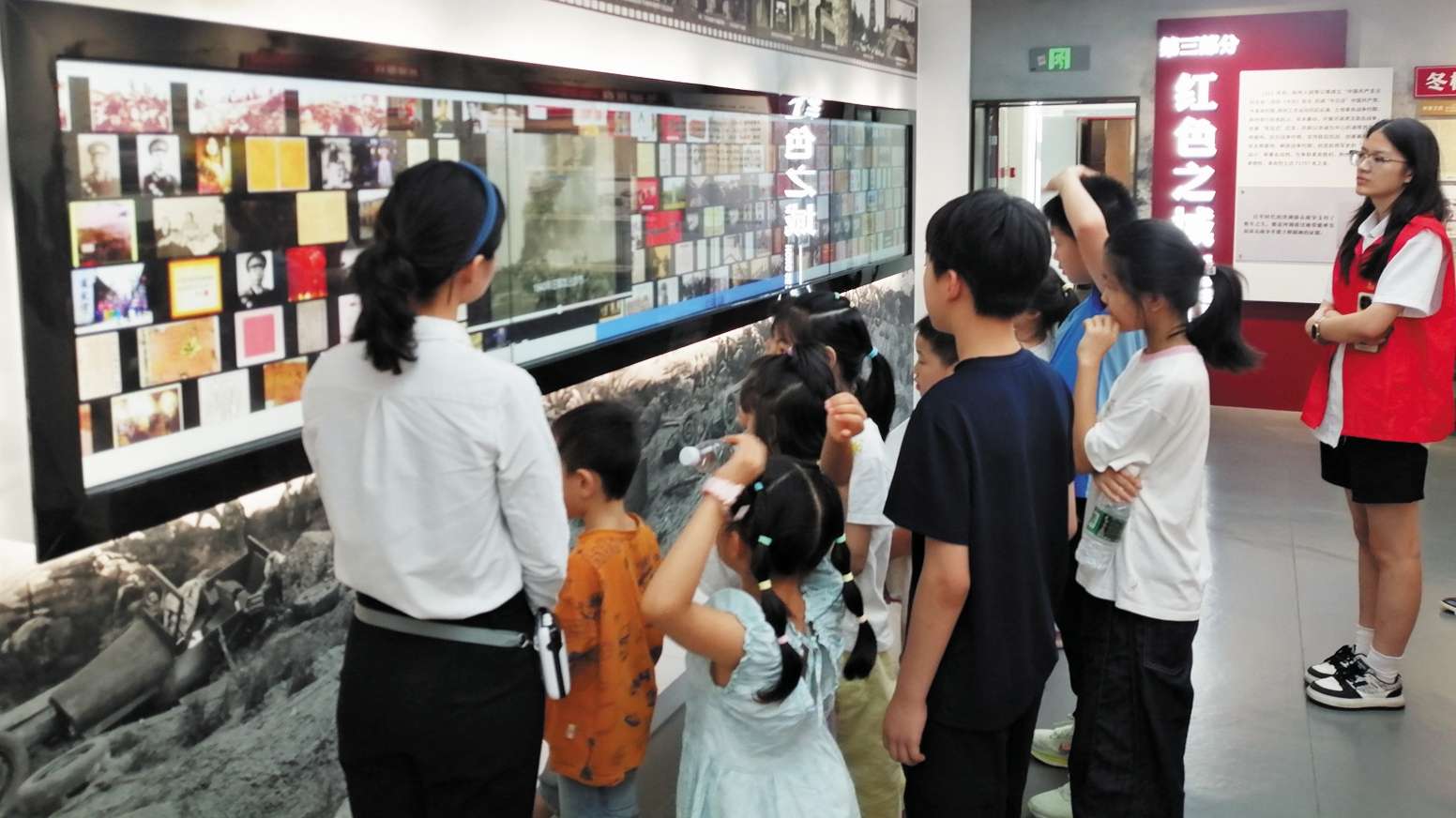 荆州小学生在荆州市档案馆兰台荆典展厅观看抗战记忆展。