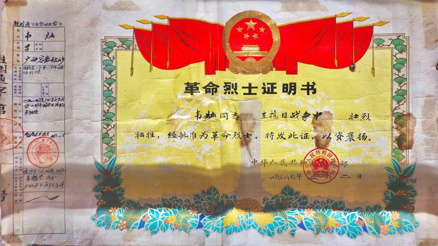 “这是1987年民政部颁发给韦灿烈士的革命烈士证明书,由其后人捐赠,是博物馆收藏的珍贵文物之一。”南宁昆仑关旅游风景区讲解员龙结萍在展柜前向游客娓娓道来。
