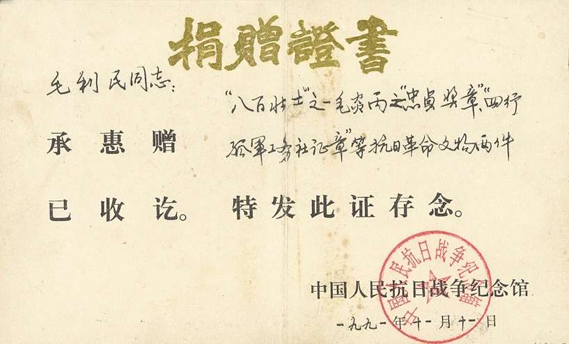 中国人民抗日战争纪念馆向“八百壮士”毛炎丙亲属颁发的捐赠证书。