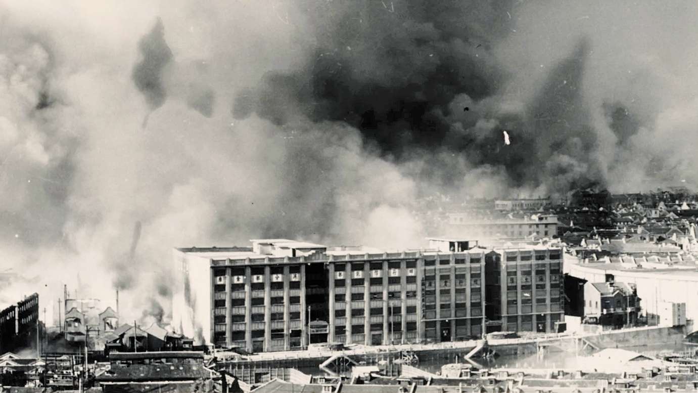 战火中的四行仓库。(上海四行仓库抗战纪念馆供图)
