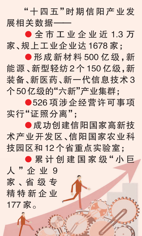 数智赋能,加速转型。“十四五”期间,信阳入选省首批数据标注基地建设试点市,培育出一批数字转型标杆企业:羚锐制药获评省级数字领航企业,万华禾香、今上半导体等3家企业建成省级5G全连接工厂;数字经济与实体经济深度融合,华为、百度等数字巨头纷纷落子信阳,人工智能计算中心开建;新增省级头雁企业4家、单项冠军企业6家、专精特新中小企业53家,仁新实业入选国家级专精特新“小巨人”企业……企业创新活力持续迸发。