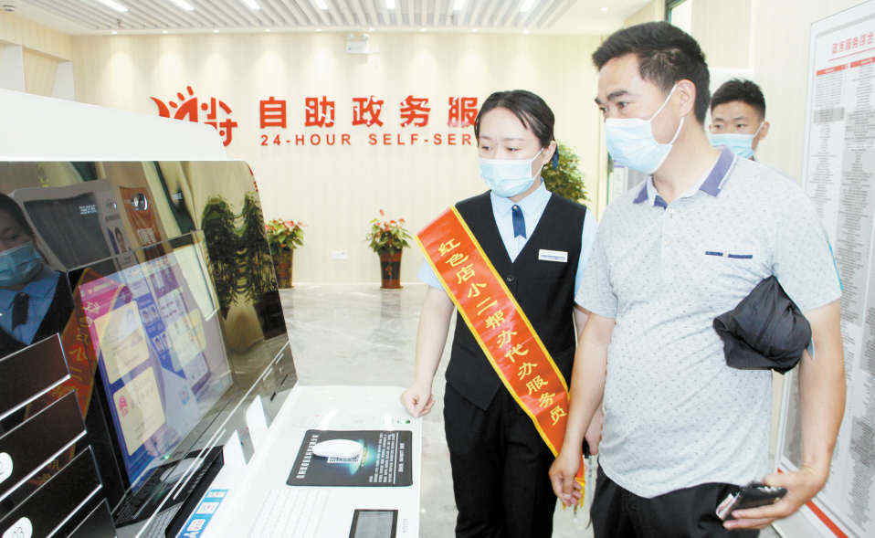 在市政务服务中心的24小时自助政务服务专区,工作人员指引市民办理各种事项。