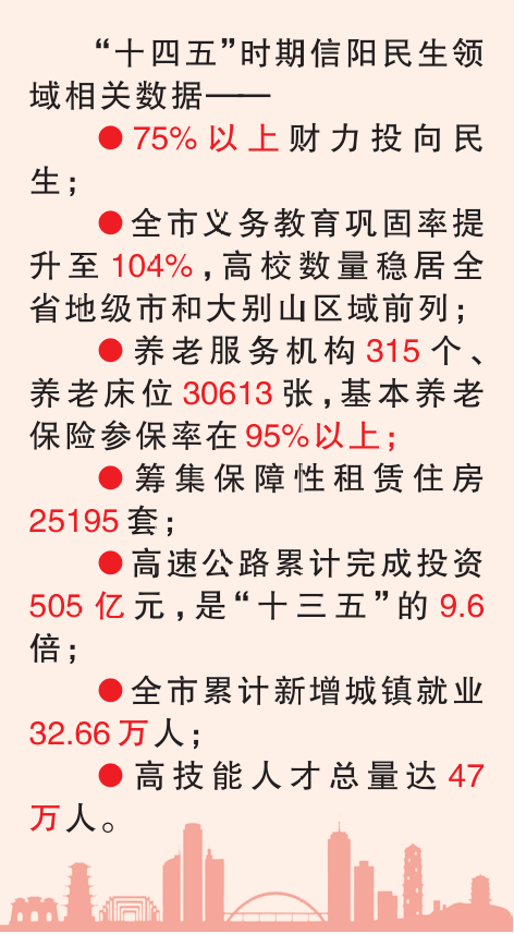 “十四五”以来,信阳的民生“温度”愈发可感可触。真金白银的投入是最有力的证明:信阳把75%以上财力投向民生,全市义务教育巩固率提升至100%,普惠性幼儿园占比提升至90.3%,高校数量稳居全省地级市和大别山区域前列,高技能人才总量达47万人;医疗网络遍布城乡,基本养老保险参保率95%以上;农村养老“戴畈模式”“汪桥经验”覆盖2082个行政村,信阳成功入选民政部、财政部居家和社区基本养老服务提升行动项目试点城市;持续实施“运动信阳”工程,行政村体育健身设施实现全覆盖,城市社区“15分钟体育健身圈”基本建成。信阳用实打实的行动证明:政府的“大事”,正是由一件件百姓“小事”汇聚而成。办好这些“小事”,收获的是市民脸上满意的笑容,筑牢的是幸福信阳最坚实的根基。