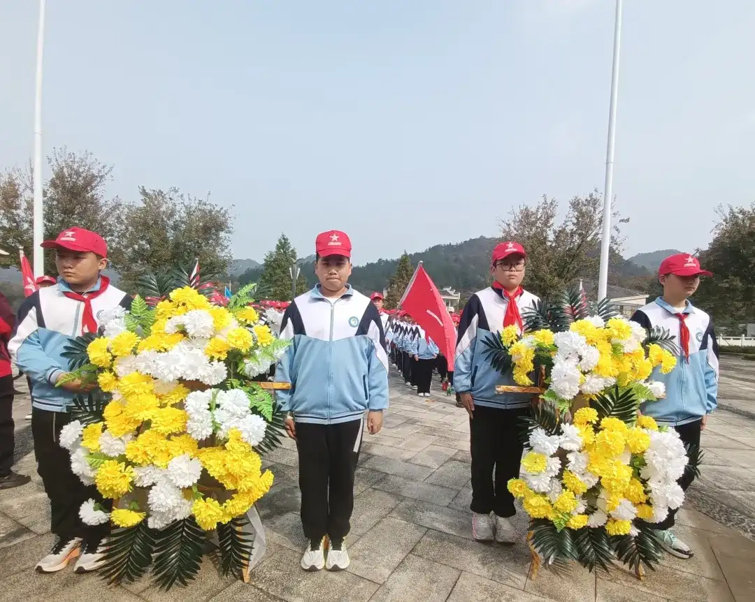 在红二十五军烈士陵园,同学们整齐列队,向革命先烈敬献花篮,低头默哀。