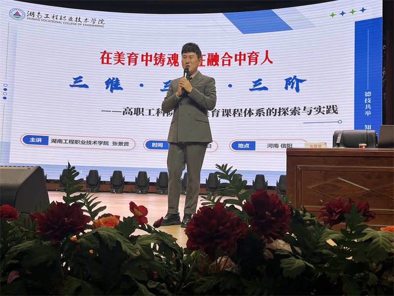 美育课堂上,湖南工程职业技术学院宣传部副部长、艺术教研室主任、副教授张景贤带来《在美育中铸魂 在融合中育人 高职工科院校“三维三色三阶”大美育课程体系的探索与实践》专题授课,为在场师生搭建起“理论+实践”的美育框架,让美育从课堂走向育人全场景。