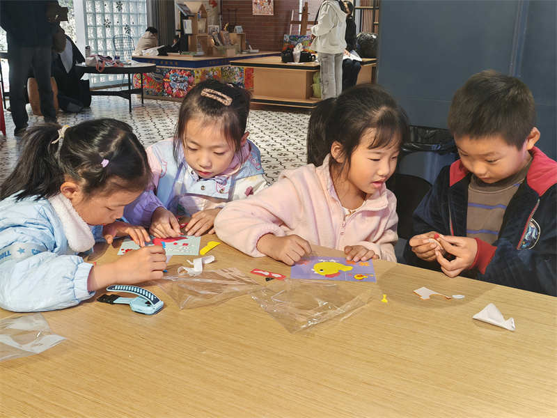 随后的手工环节更是欢声笑语不断。孩子们用绒布、干花和彩纸制作立体粘贴画。“妈妈快看!我的雪人住在彩虹树下!”5岁的李雨桐捧着作品,小脸上满是自豪。她的母亲张女士感慨:“现在孩子接触传统文化的机会多了,这样的活动既有趣又有意义。”