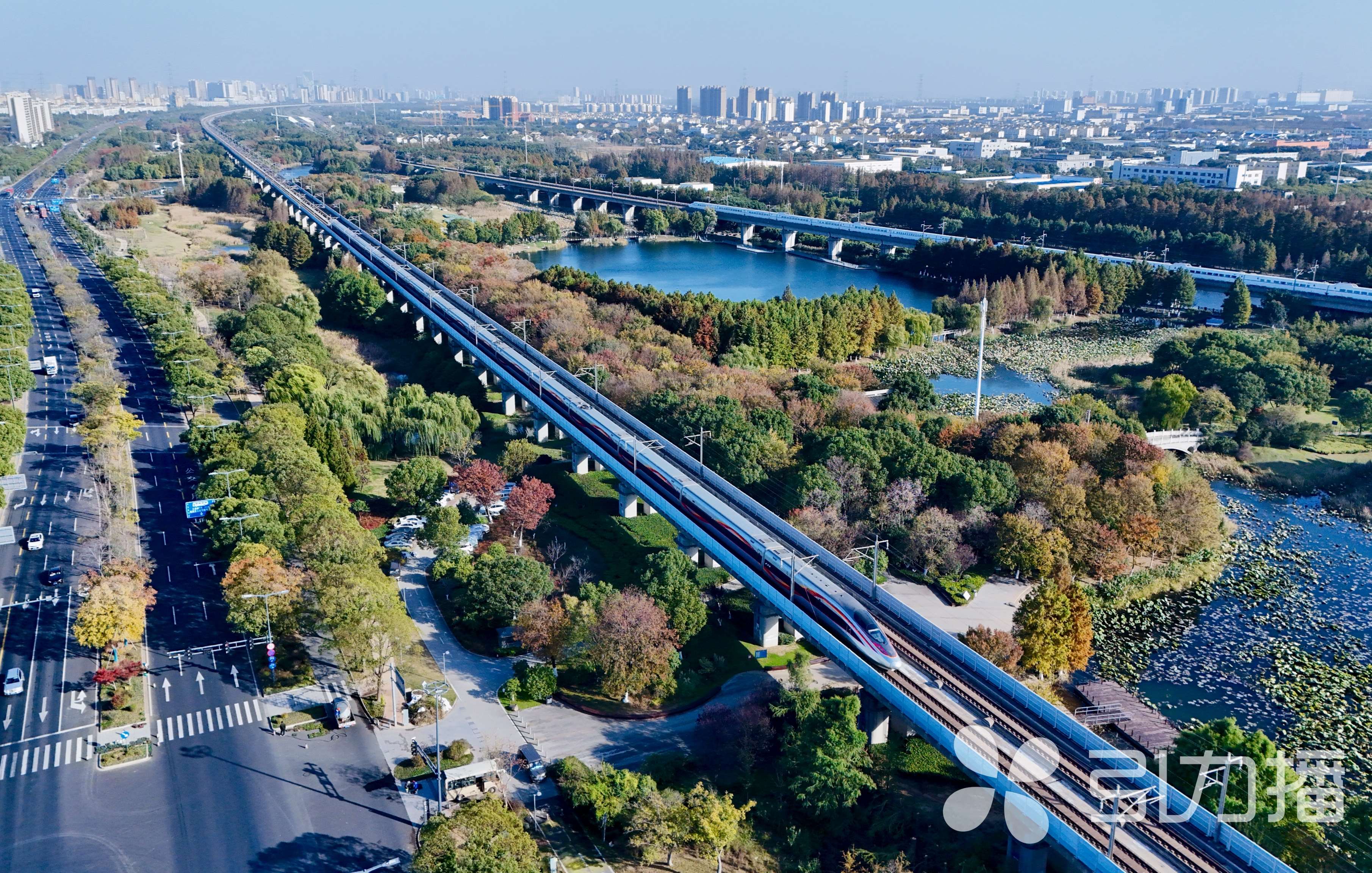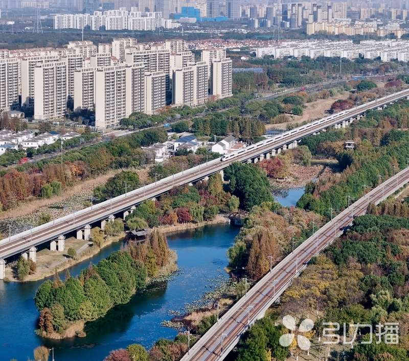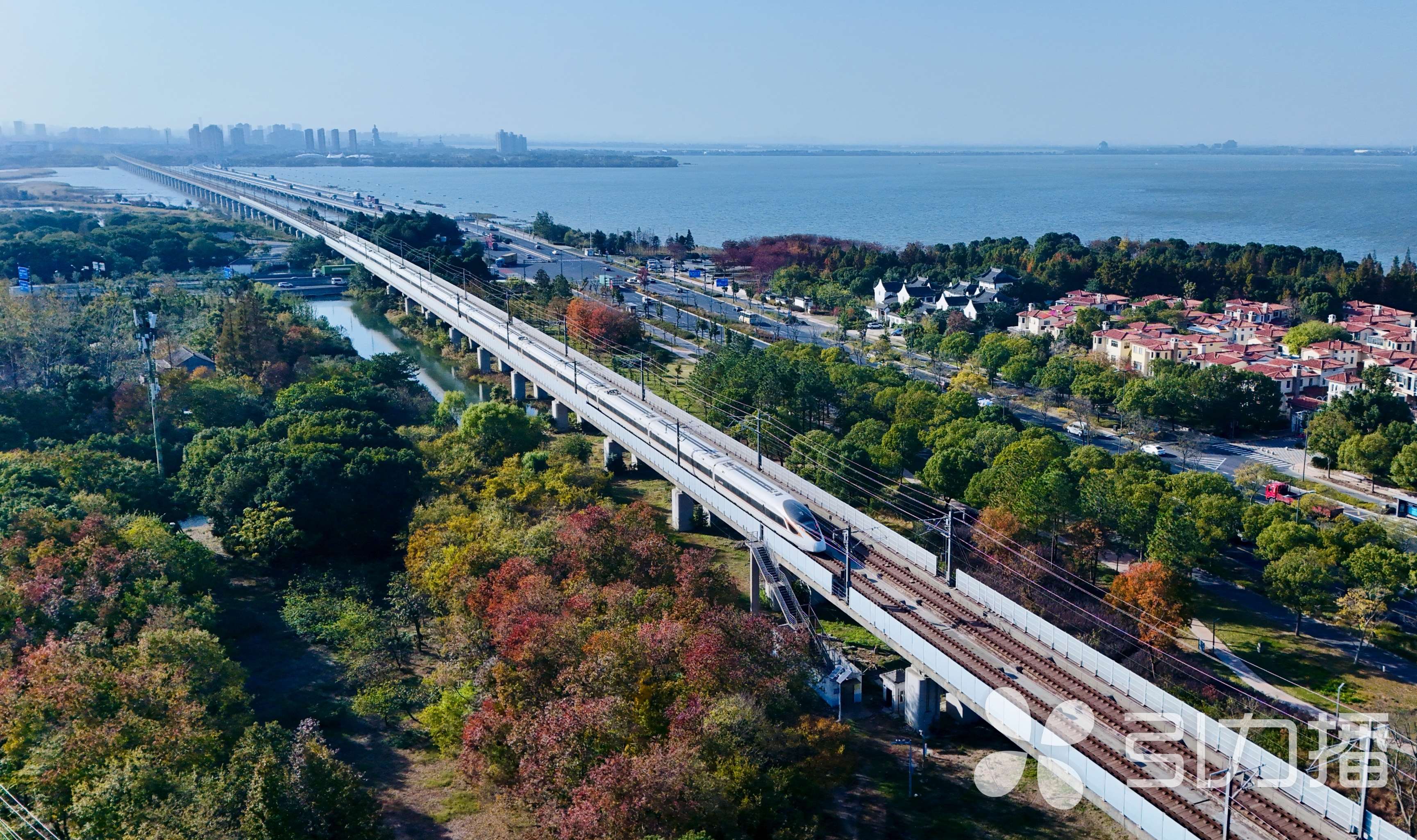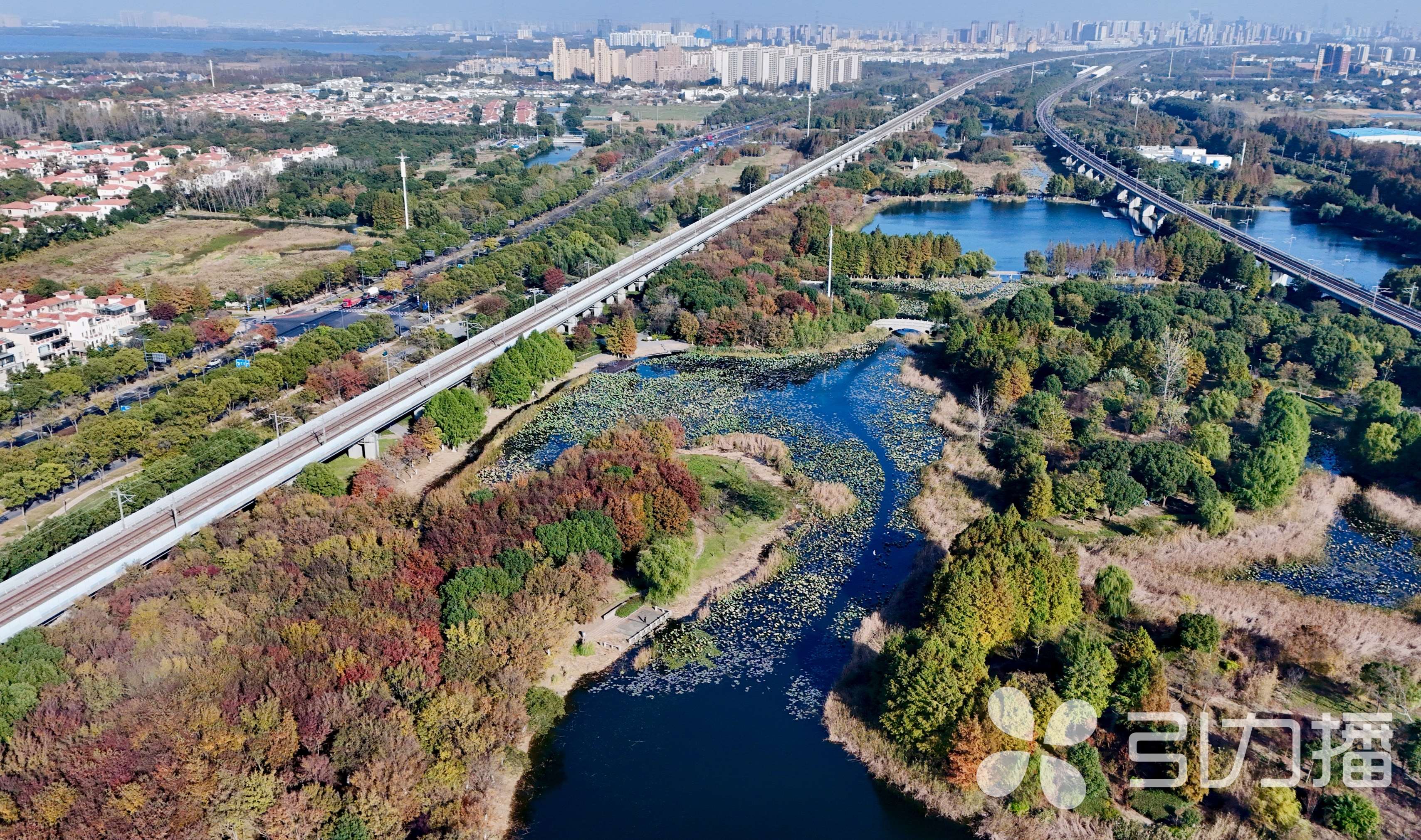 从空中俯瞰,湿地层林尽染,水杉林褪去青翠,披上赭红与鎏金交织的羽衣。飞驰的沪宁高铁列车掠过这片锦绣,现代速度与自然静谧在这片湿地奇妙交融。(苏报融媒记者 王亭川/文/摄/摄制)