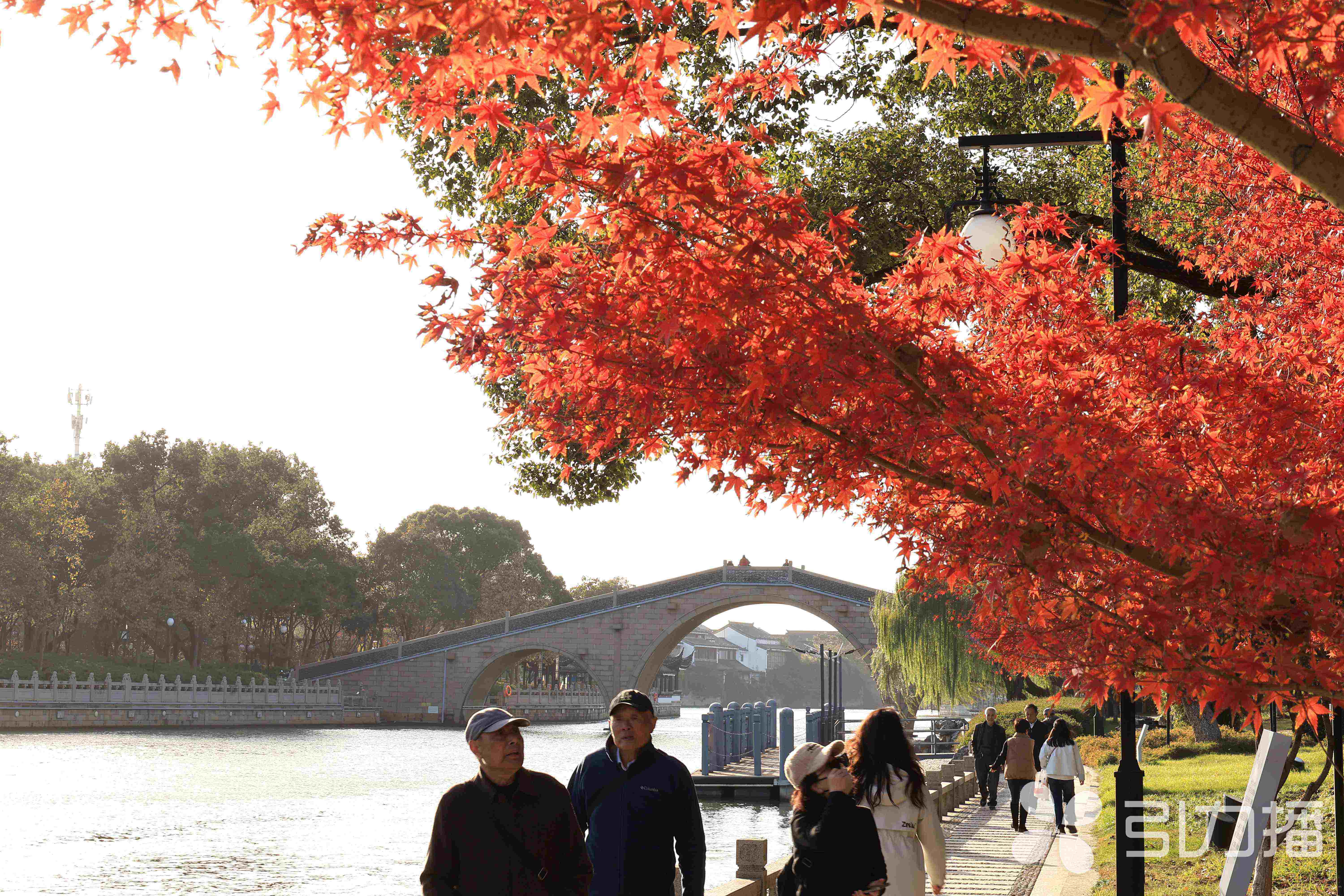 苏州环古城河健身步道蟠龙桥至人民桥段两侧,枫树正悄然换上红装,远远望去,宛如一条蜿蜒流淌的“火焰走廊”,在微凉的风中熠熠生辉,让整座城市充满诗意。11月27日,记者在这里看到,市民和游客正纷纷前来打卡这条镶嵌在古城脉络中的“长廊”。