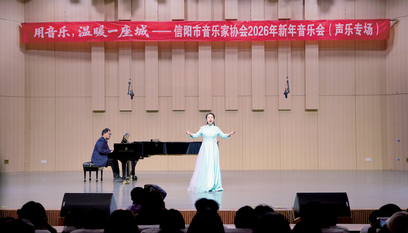 12月21日晚,信阳市音乐家协会2026年新年音乐会在信阳师范大学剧场举办。这场音乐会以“用音乐,温暖一座城”为主题,汇聚了我市各县区和高校的音乐力量,通过声乐、器乐等多种形式,呈现了一场融合传统与现代、扎根泥土的音乐盛宴。