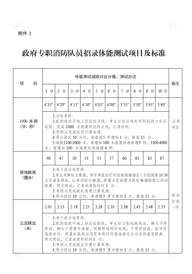 体能测试主要考查应聘人员的基本体能素质,满分为100分。体能测试共设置1000米跑(必考)、单杠引体向上/俯卧撑(二选一)、立定跳远/仰卧起坐(二选一)、10米×4往返跑/100米跑(二选一)四个项目,各项成绩分别按25%计入体能测试总分。(详见《政府专职消防队员招录体能测试项目及标准》附件2)。