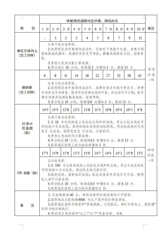 以上四个项目,如有一项未达到合格(60分)标准的,不得进入面试环节。在体能测试合格人员中,成绩从高到低排名。体能测试成绩将在体能测试现场中予以公布。注:参加体能测试人员需携带本人身份证及相关证件。