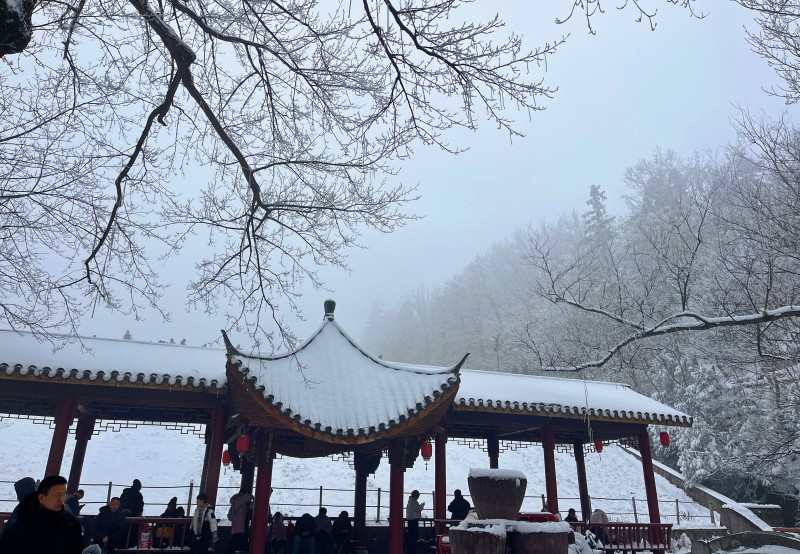 放眼望去,漫山遍野的树木被白雪覆盖,琼枝玉树,冰凌垂挂,阳光洒落时,折射出晶莹的光芒,将这座名山装点得如梦似幻。主峰报晓峰在白雪的映衬下,更显雄奇挺拔,仿佛一只昂首欲鸣的雄鸡,守护着这片冰雪仙境。山间的亭台楼阁、石阶小径,皆被白雪覆盖,一步一景,步步皆诗,让人流连忘返。