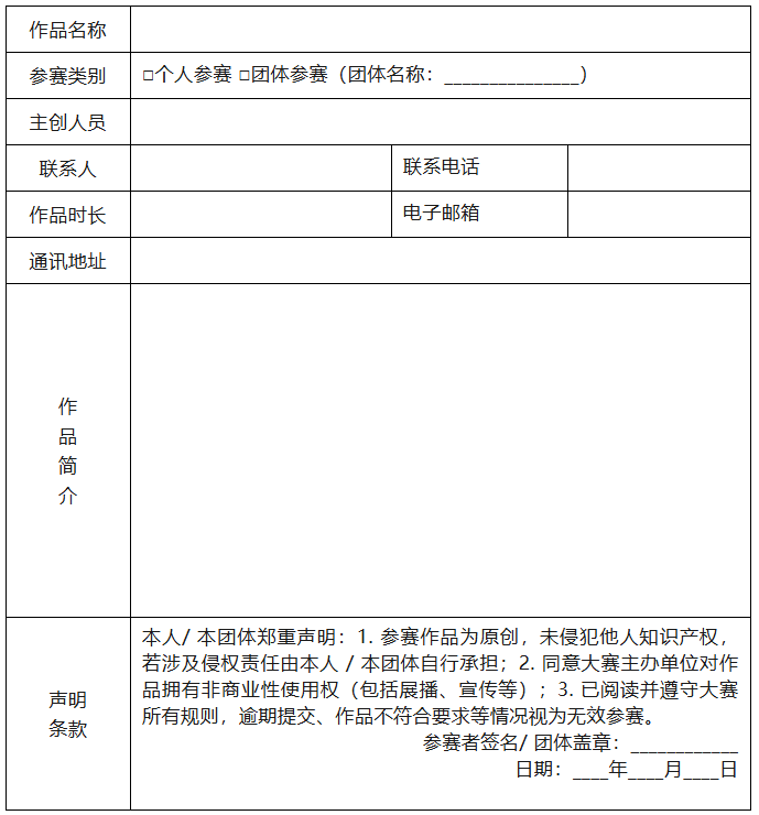 2.同一参赛者可提交多个作品,但每个作品需单独提交报名表,多个作品不重复获奖(以最高奖项为准)。