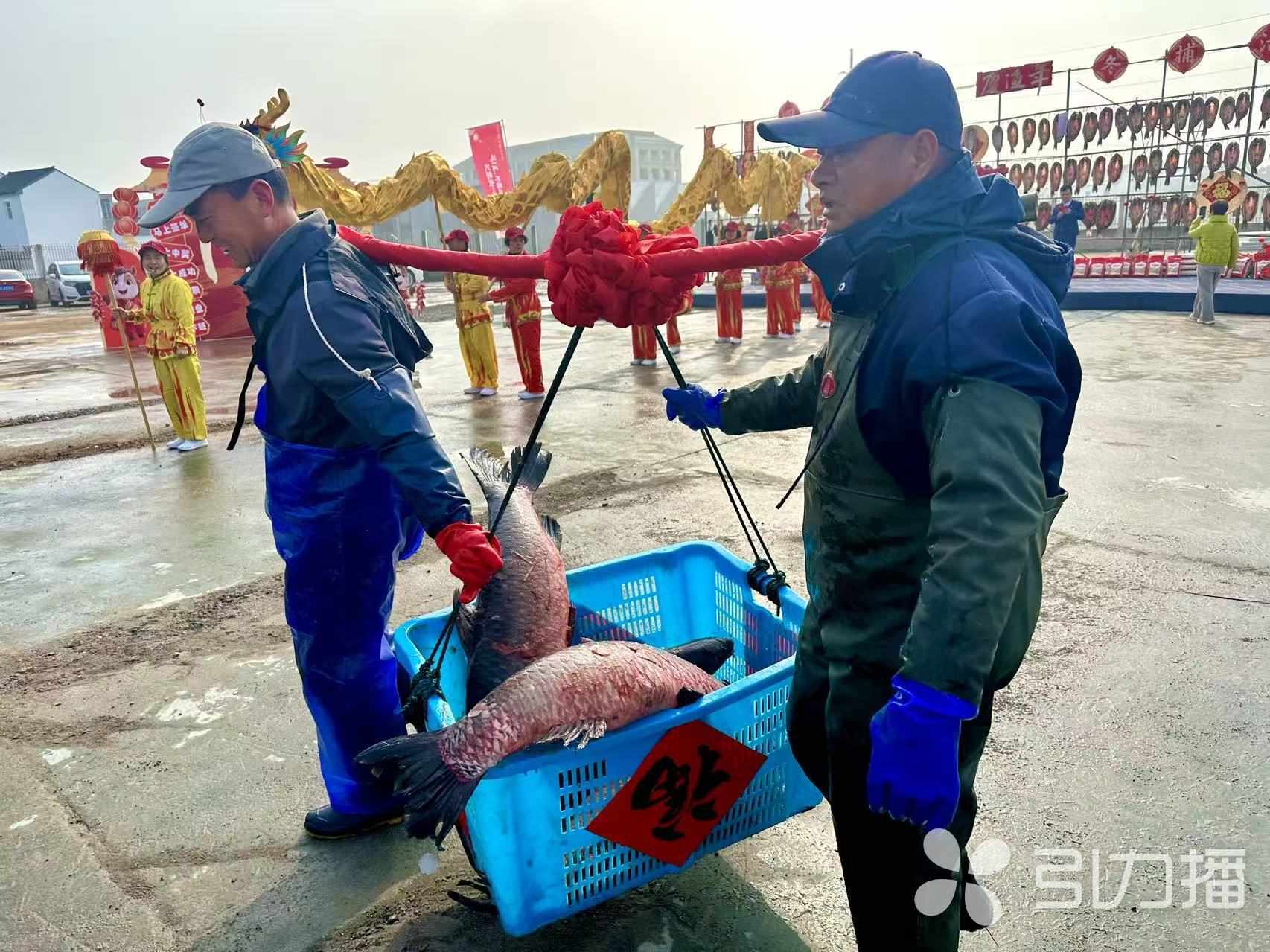 上午10时,活动现场锣鼓喧天,舞龙舞狮队翻腾跳跃,拉开了冬捕的序幕。随着一声响亮的鸣锣,“起网”号令响彻湖畔。前期征集的36名冬捕拉网勇士合力拉动渔网,湖水翻涌间,银光闪闪的鱼儿跃出水面,引得岸边游客阵阵欢呼。活蹦乱跳的青鱼、草鱼、鲢鱼在网中挤作一团,“鱼跃人欢”的丰收图景跃然眼前。“首网共捕获6000余斤各类鱼货,丰收满满。”江村农文旅发展有限公司总经理吴慧告诉记者。