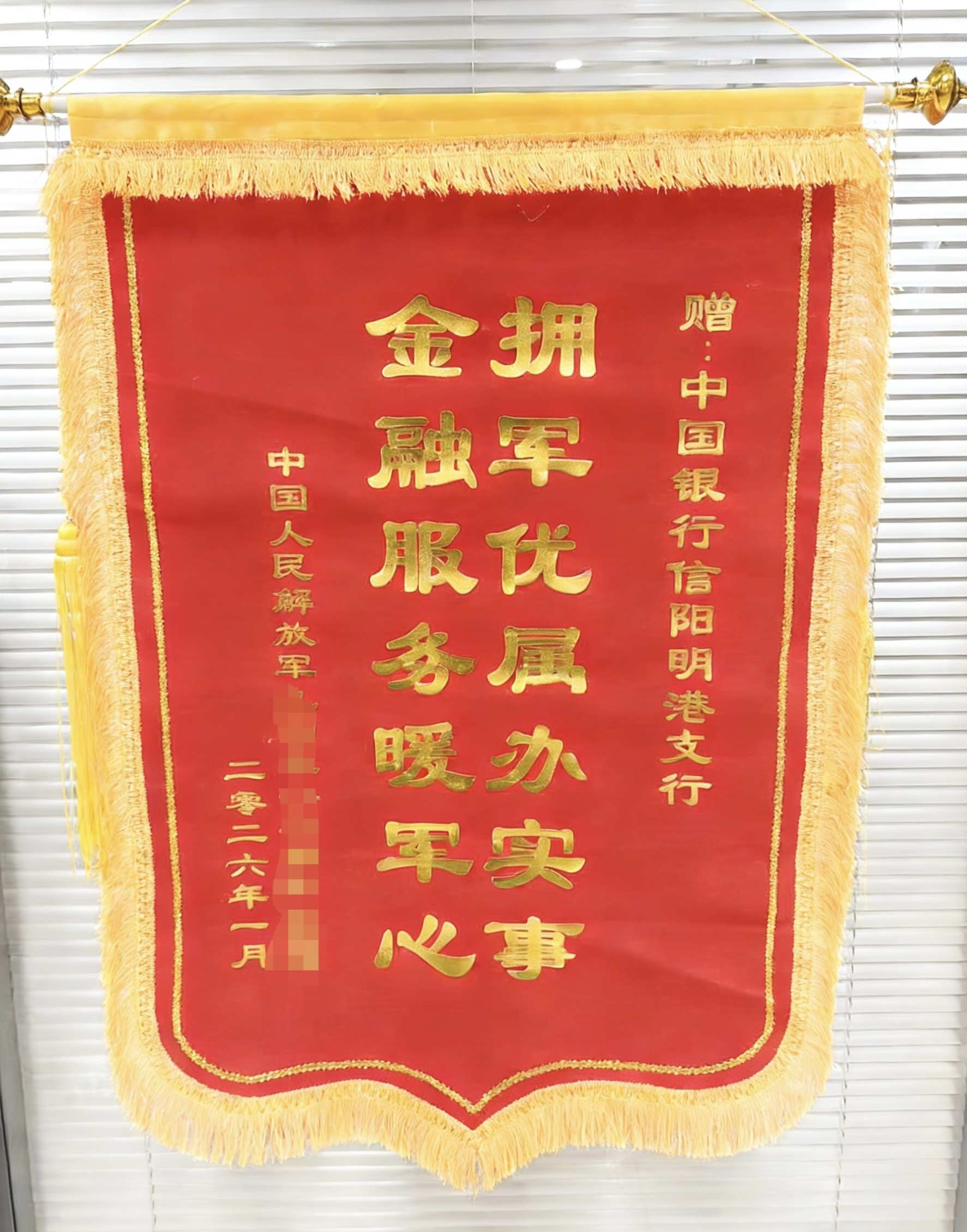 近日,中国银行信阳明港支行收到一面解放军某部官兵送来的锦旗,锦旗上“拥军优属办实事 金融服务暖军心”十四个大字熠熠生辉。这面锦旗不仅表达了官兵对该行高质量金融服务的充分认可,更彰显了该行拥军优属的责任担当。