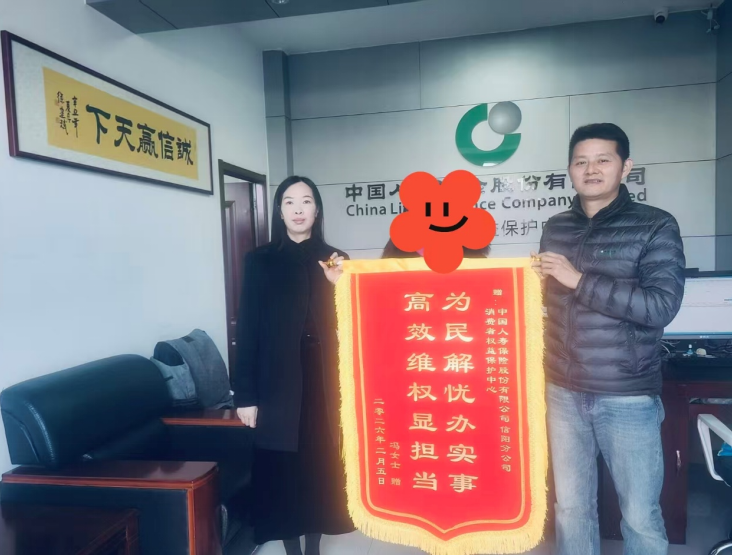 近日,中国人寿寿险信阳分公司消费者权益保护中心凭借专业、高效、有温度的服务,成功化解一起保单纠纷,切实维护消费者合法权益。2月11日,客户冯女士专程来到该公司,将一面锦旗送到消保中心工作人员手中,对公司负责尽责、暖心为民的服务表示诚挚谢意。