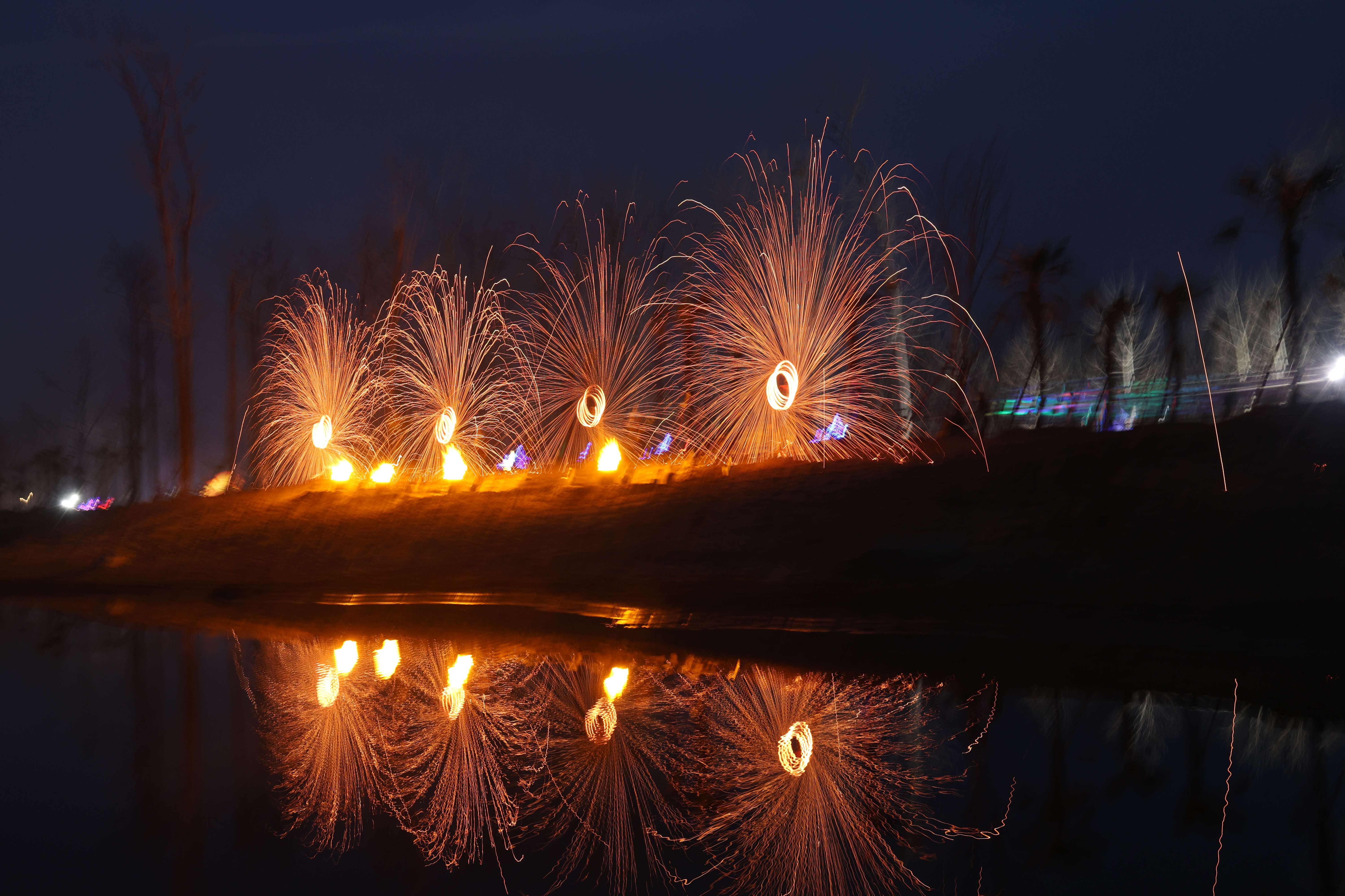 夜幕降临,非遗夜游点亮淮河之滨。千年绝技“打铁花”凌空绽放,火树银花映照夜空;风火轮、火壶等民俗表演登场,火光与夜色交织成一幅幅震撼人心的画卷,将节日氛围不断推向高潮。