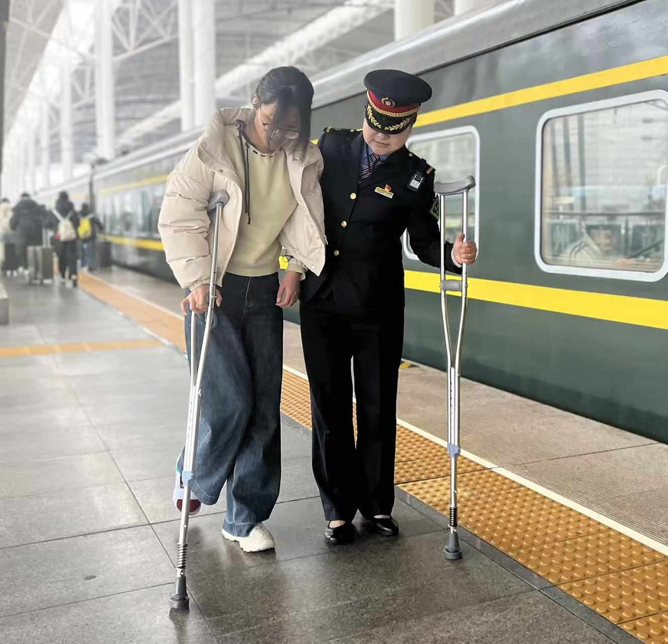 为让小郭下车时也能顺畅无忧,王敏提前联系信阳车站,帮助他预约了重点旅客服务。列车到站后,王敏稳稳地搀扶小郭下车,将其安全地移交给了前来接应的车站工作人员。